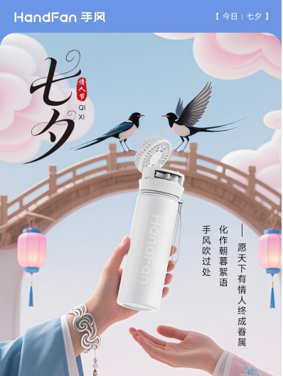 鹊桥风软拂罗衣,今以手风寄相思。扇叶轻旋星河转,杯水轻漾浮光摇。将执手相看的私语,谱成朝朝暮暮的絮语。——手风,愿天下有情人终成眷属!